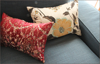 当社ではお客様のお気に入りのカーテンを、新たなサイズに合わせて再縫製します。また、カーテンのキズやシミの部分をカットしお気に入りの生地を足すお直しや、カーテンからクッションやマルチカバーへのリメイクも可能です。